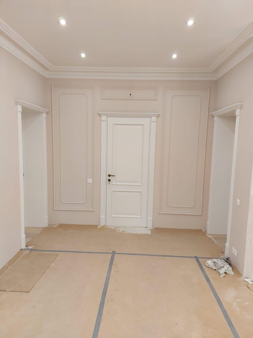 Полотно тамбуратное из инженерного массива (МДФ + ламельный/листельный массив лиственных пород) толщиной 50 мм. с повышенной шумоизоляцией,окра шенное матовыми красками итальянского производства SIRCA с эффектом «soft touch» по шкале RAL с возможностью двусторонней окраски. Объемные филенки, стекла крепятся к полотну с помощью фигурных штапиков (багетов).