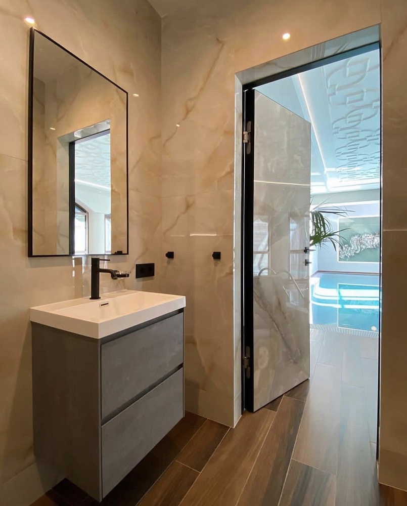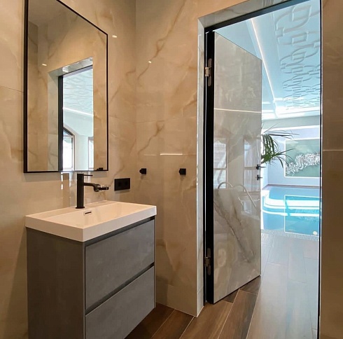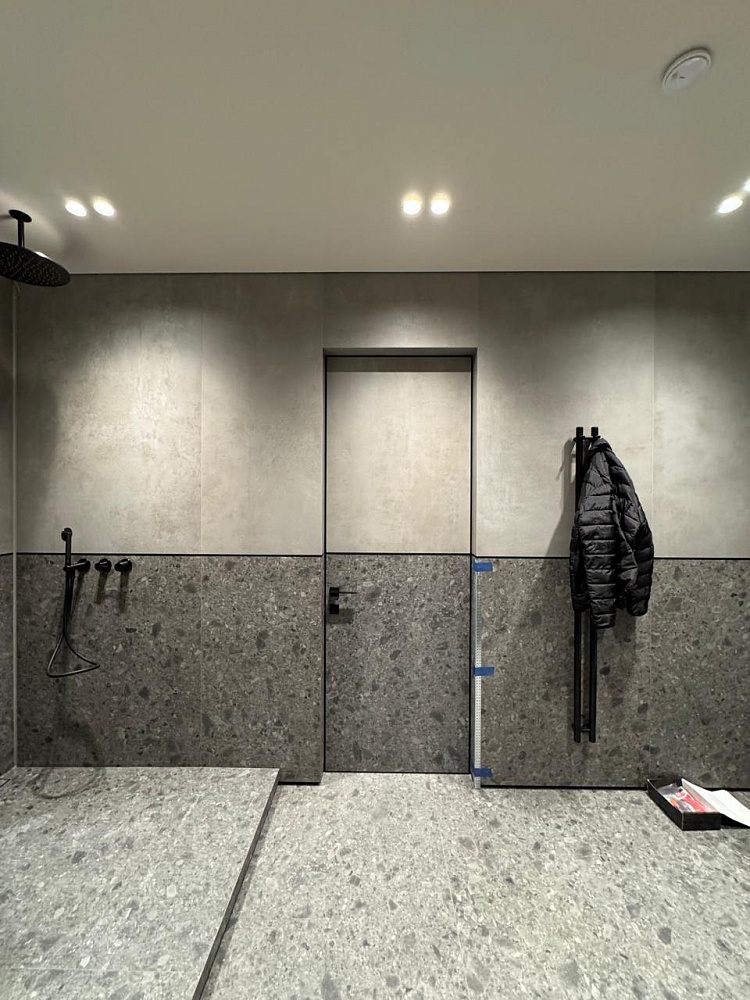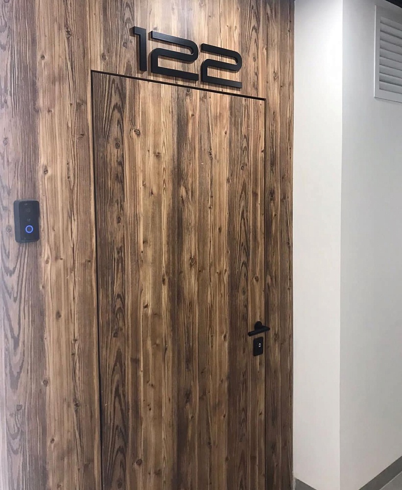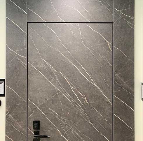 Современно и эстетично. Добавить графичности или сделать акцент именно на скрытой двери помогут современные отделки, например, шпонированные панели или оформление антивандальным материалом с имитацией природного камня. Бонус - возможность изменения облика в соответствии с новыми требованиями интерьера.