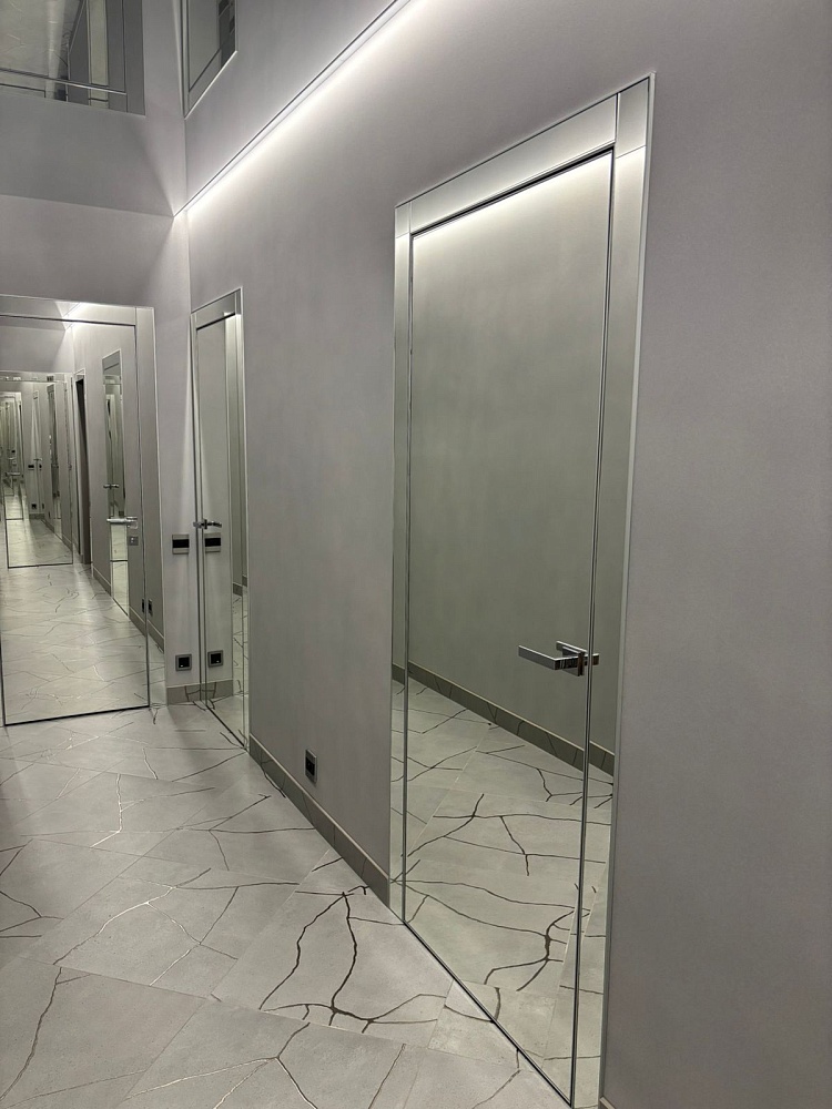 В производстве дверных полотен распространены стеклянные, пластиковые и металлические материалы. Использование зеркал и отражающих поверхностей рассеивает свет, что позволяет визуально увеличивать площадь квартиры.